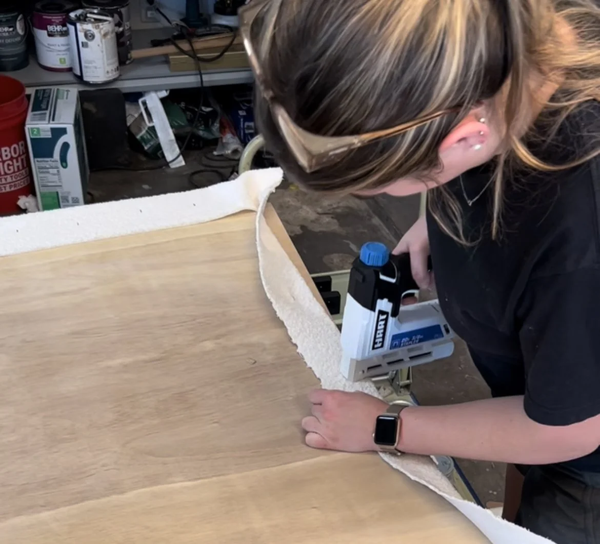 i then placed the foam and plywood facedown on top of the boucle fabric. i cut the fabric with about 2” extra fabric on each side. i pulled the fabric over the foam and used my crown stapler to staple it into the plywood! leave corners for last & make sure not to pull fabric too tight!