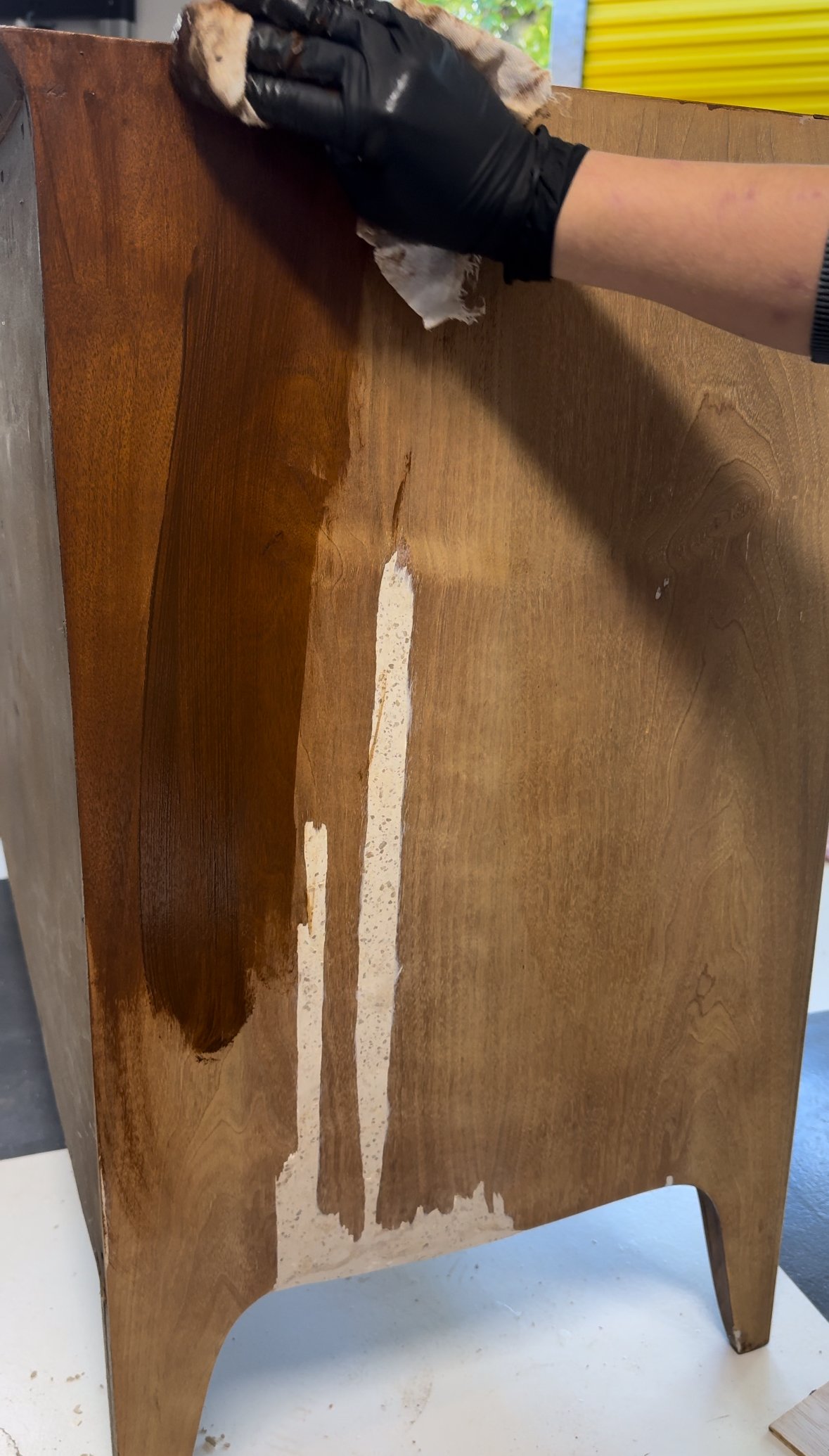 Once the veneer was prepped, it was time for stain! (side note: I did NOT apply any pre-conditioner since this was walnut veneer and walnut is a hardwood) I applied my favorite stain for mid century pieces… aka Mohawk medium brown walnut wipe-on stain (M545-02056)! Unfortunately, this stain can’t be bought on Amazon, so I have to buy it directly from the supplier. Sometimes you might be able to find it at a local paint store! Be sure to wear a respirator when using this stain as it is professional grade & can cause health problems. Anyways, this stain brought back the timeless touch and totally accentuated the natural elegance of the sideboard… bringing it closer to it’s original beauty! This step required a keen eye for balance and an understanding of the wood's character.