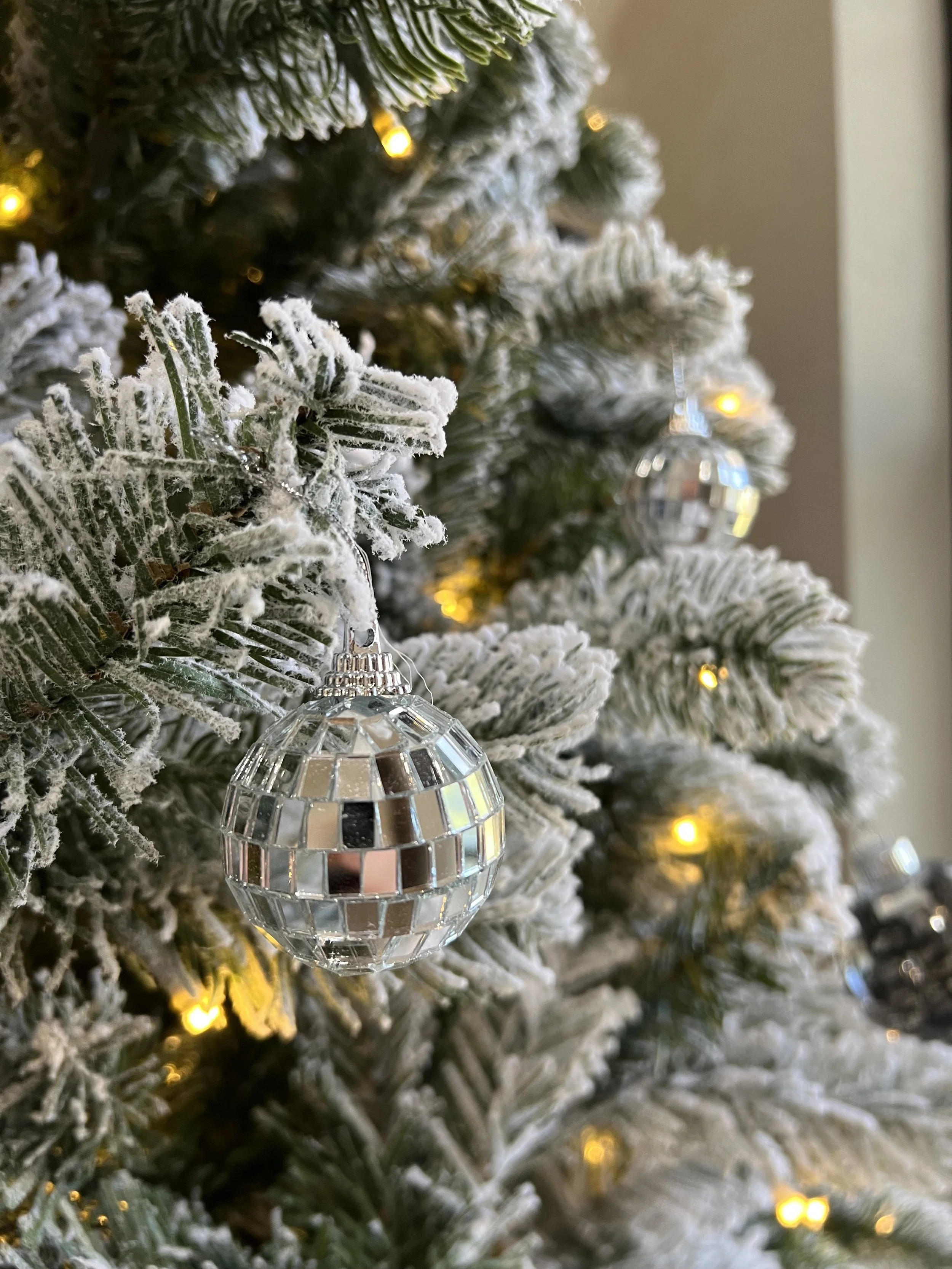 Once it was all shaped & set up, I turned on the lights. This tree is SO PRETTY. It has so many different lighting settings, a remote & a pedal switch to turn on and off! It's seriously so pretty, I almost didn't even want to put any ornaments on it. I am honestly considering being one of those people who keeps their tree up year round & change the ornaments for every holiday. Like, an Easter tree? A Halloween tree? BET. But for the meantime, we decided to go with a DINO & DISCO theme, which is totally awesome.
