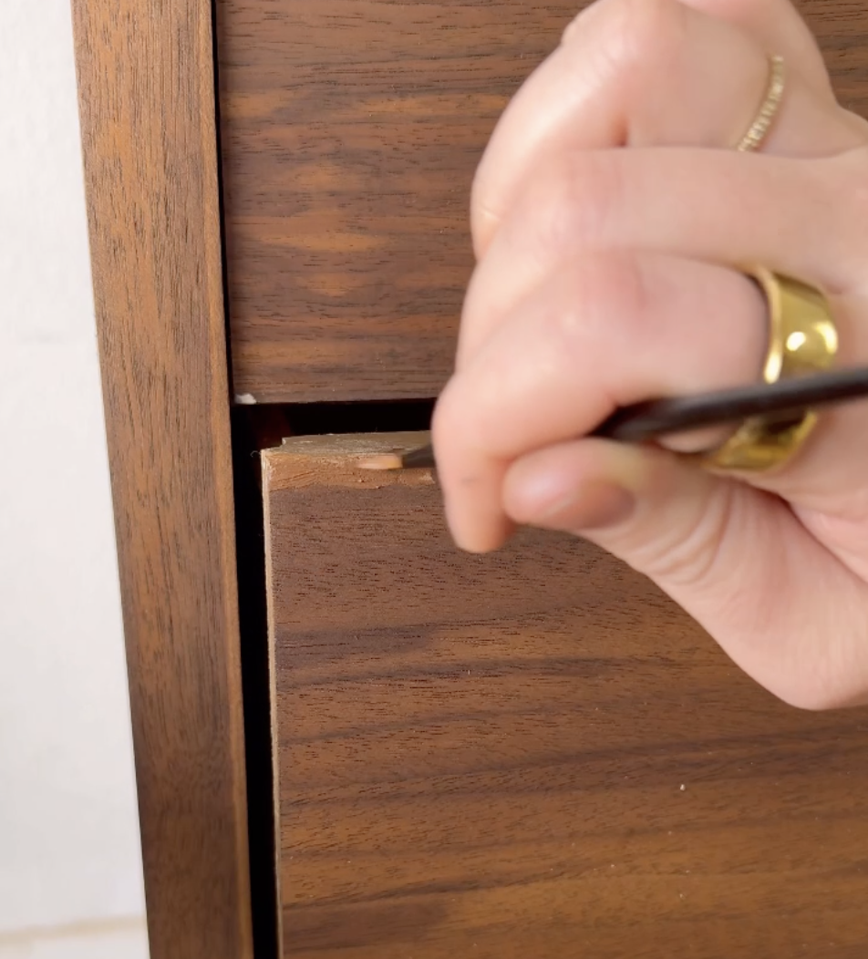I used a veneer paint kit to disguise the epoxy repairs I made earlier, ensuring seamless integration with the dresser's original aesthetic.